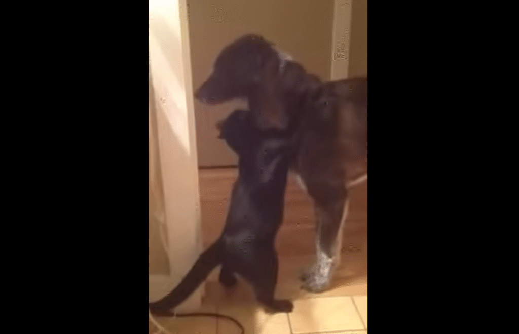 After ten days apart, a touching moment unfolds as a cat eagerly greets its canine companion. From the moment the dog enters the room, the cat rushes forward — brushing against the dog, rubbing its face affectionately, and following closely as if trying to make up for lost time.